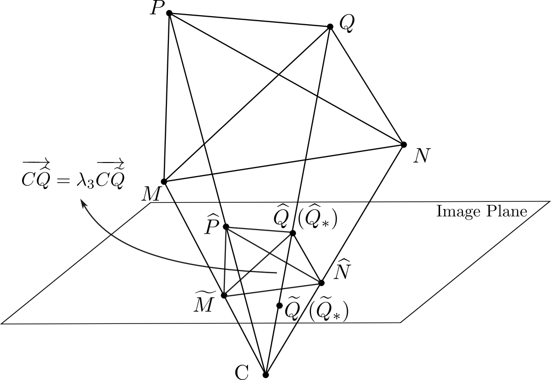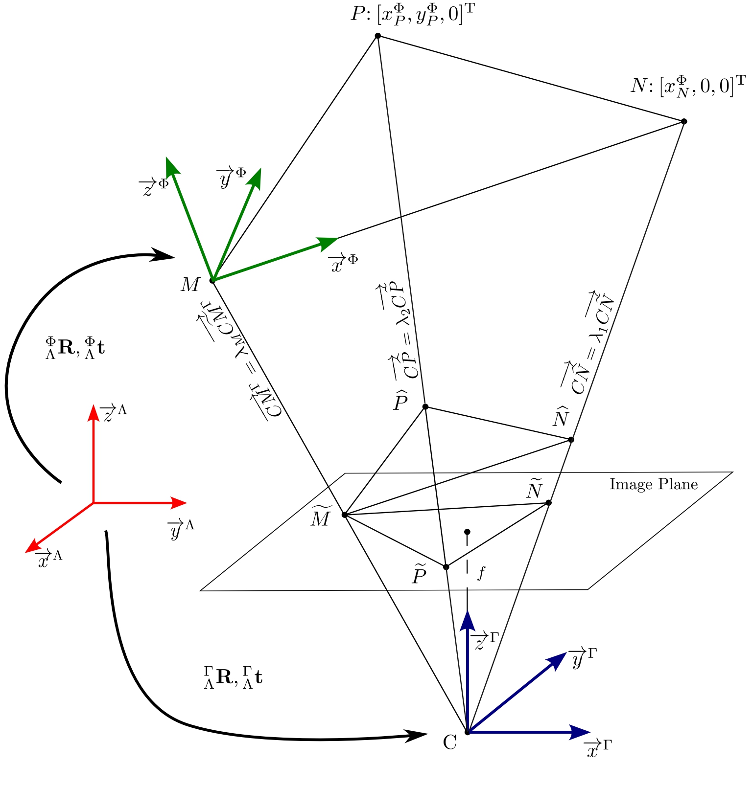 After further manipulations, the following matrix form containing geometric constraints can be obtained \begin{equation} \begin{split} &[_{ \Phi}^{ \Gamma}\mathbf{R}_{ (:,1)}, \,_{ \Phi}^{ \Gamma}\mathbf{R}_{ (:,2)}, \,_{ \Phi}^{ \Gamma}\mathbf{t}]\begin{bmatrix} x_{ N}^{ \Phi} & x_{ P}^{ \Phi} & \\[0.5mm] & y_{ P}^{ \Phi} & \\ & & 1 \end{bmatrix} = \,\, &\lambda_{ M}\,[\widetilde{\mathbf{n}}_{ (3)}^{ \Gamma}, \widetilde{\mathbf{p}}_{ (3)}^{ \Gamma}, \widetilde{\mathbf{m}}_{ (3)}^{ \Gamma}] \begin{bmatrix} \lambda_1 & & \\ & \lambda_2 & \\ -1 & -1 & 1 \end{bmatrix}. \end{split} \end{equation}