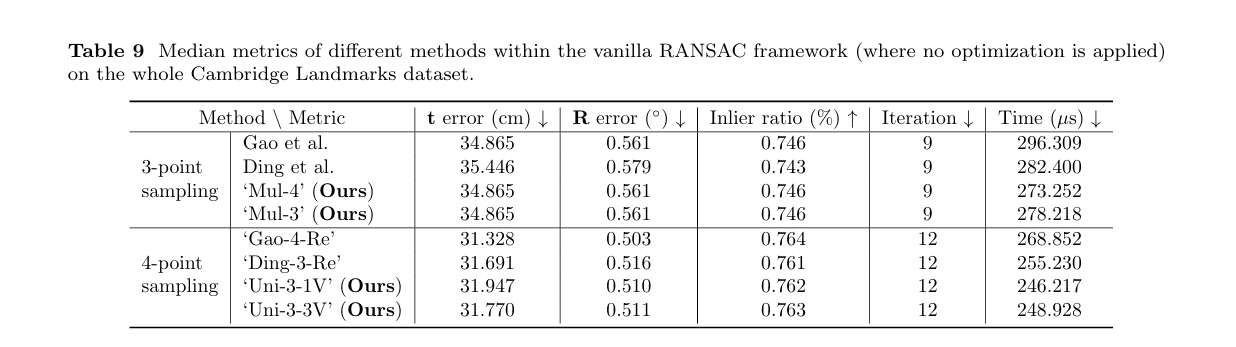 The following table shows the localization results within the vanilla RANSAC framework on the Cambridge Landmarks dataset.